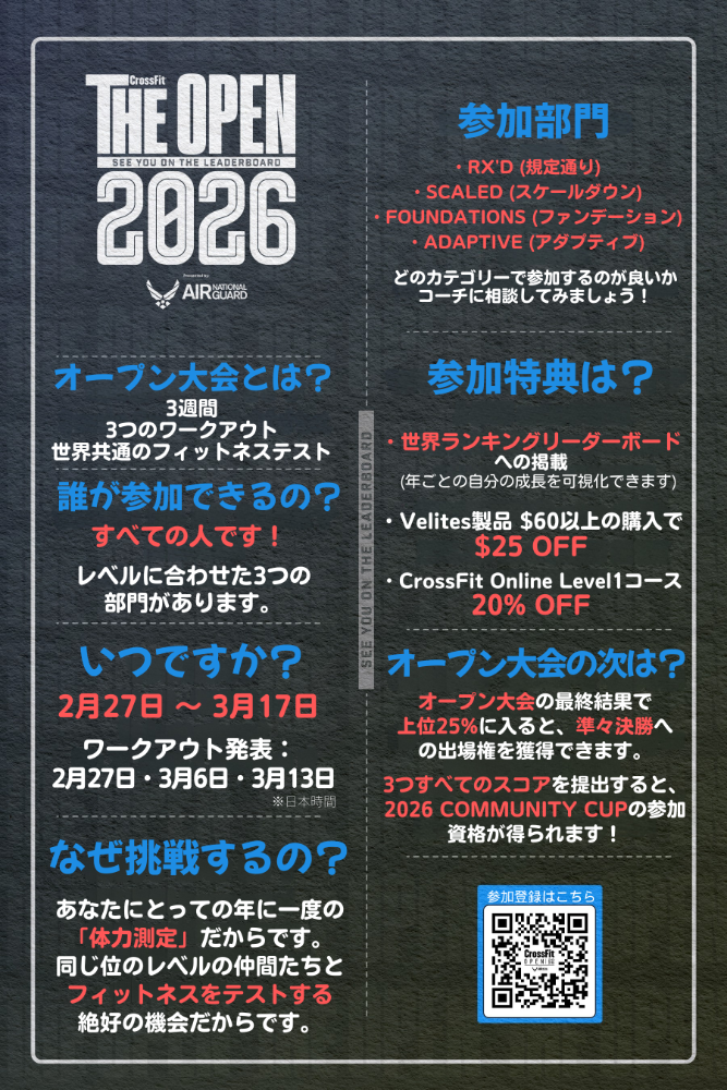 オープンは、クロスフィットゲームズと呼ばれる大会の最初のステージで、最終的には7月に行なわれる決勝大会につながります。2026年のオープンは3週間に渡り開催され、1週間毎に1回、合計3回ワークアウトを行います。簡単に参加してやり遂げることができ、🌎世界中の他のフィットネスファンとつながることでグローバルな雰囲気を作り出すことができます🌏
